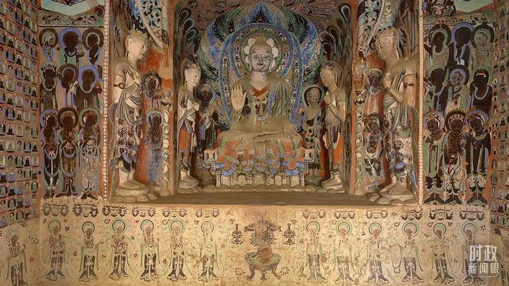 △敦煌莫高窟第420窟,创建于隋,南、西、北壁各开一龛,被称为“三龛窟”。敦煌文化被认为集建筑艺术、彩塑艺术、壁画艺术、佛教文化于一身。(资料图)