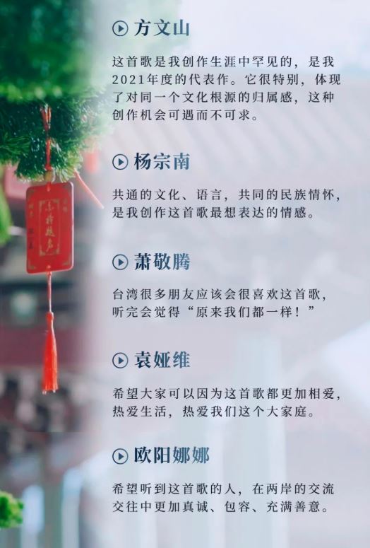 《我们同唱一首歌》由台湾音乐人方文山作词,大陆音乐人杨宗南作曲,萧敬腾、袁娅维、张杰、欧阳娜娜、陈立农等两岸青年歌手倾情献唱。两岸音乐人用心用情创作演绎,表达了对这首歌的喜爱之情,也唱出了他们的心声。