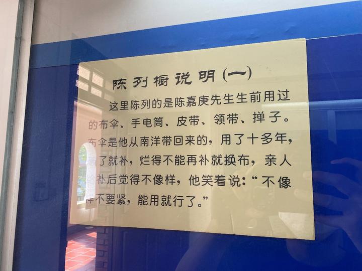 不仅对儿孙,陈嘉庚先生更是以身作则。在故居内,我们看到了他生前使用的物品:油漆斑驳的桌椅、陈旧的木床、退色的打着补钉的蚊帐、破旧的分不清颜色的毛背心、包头铁皮已经裂开的手杖、补了又补的雨伞等,都是陈嘉庚生前一直使用的。