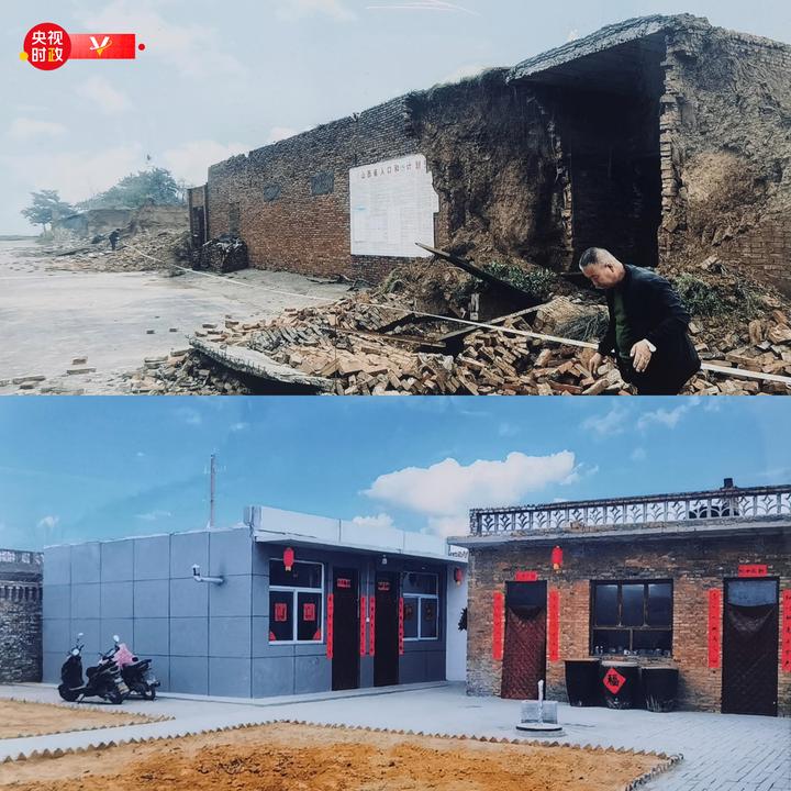上图为师红兵一家受灾后倒塌的窑洞,下图为灾后重建的装配式住房,共两间平房,面积50平方米