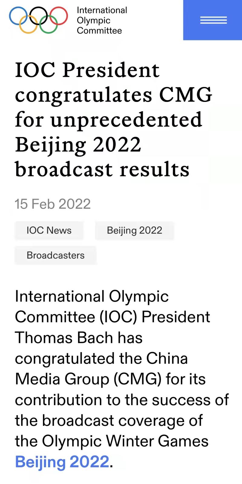 据国际奥委会官方网站2月15日消息:国际奥委会主席托马斯·巴赫对中央广播电视总台为成功转播报道2022年北京冬奥会所做出的贡献表示祝贺。