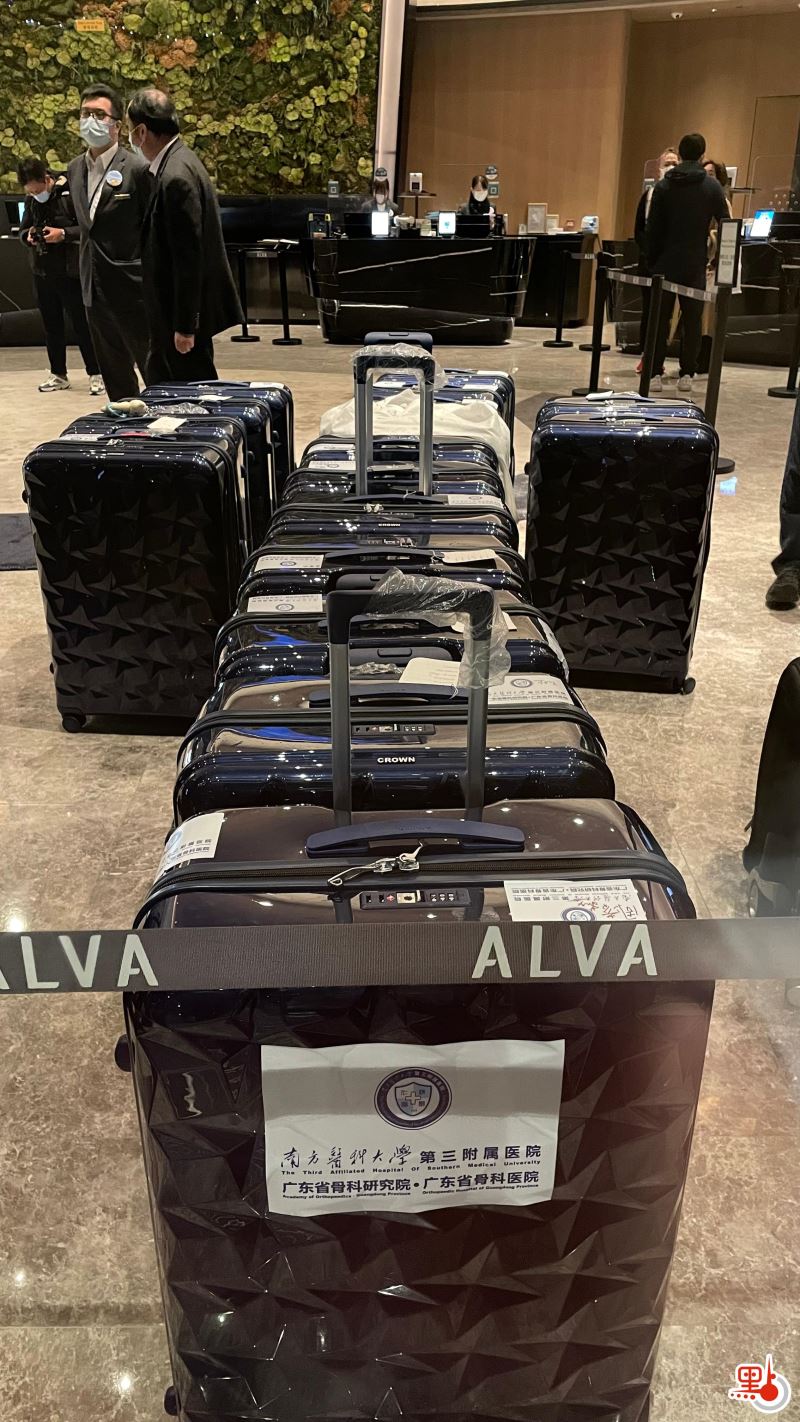 援港醫療隊成員的行李箱都貼有個人姓名標籤,整整齊齊地擺放在酒店大堂。(點新聞記者楊新雨攝)而核酸採樣隊由4名管理人員和106名廣東醫務人員組成,隊員們分別來自廣東省人民醫院、中山大學附屬第一醫院、暨南大學附屬第一醫院、廣東省中醫院和南方醫科大學第三附屬醫院等5所醫院。
