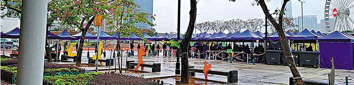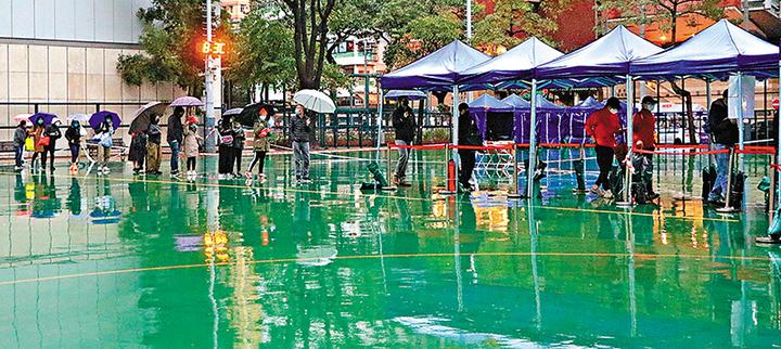 不過,各區檢測中心及流動採樣站昨日仍然爆滿,部分站點同時有數百人輪候。香港文匯報記者昨日於中環愛丁堡廣場的檢測站所見,約有三四百人排隊檢測,輪候市民冒着寒冷天氣等待。採樣站位於廣場中央,因應天雨,承辦商連續架設起多個帳篷,一路接駁至香港大會堂的簷下走廊,讓市民由取籌至採樣均無須淋雨。