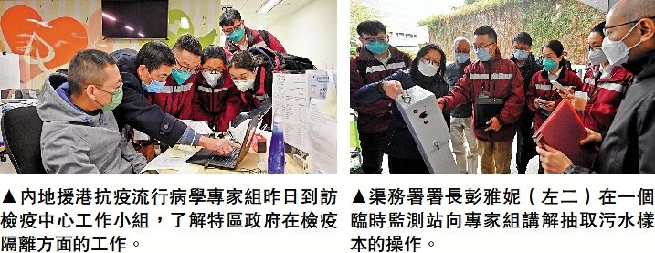 左圖:內地援港抗疫流行病學專家組昨日到訪檢疫中心工作小組,了解特區政府在檢疫隔離方面的工作。右圖:渠務署署長彭雅妮(左二)在一個臨時監測站向專家組講解抽取污水樣本的操作。(大公報 記者 邵穎)協助本港應對第五波疫情的內地援港抗疫流行病學專家組昨日繼續考察行程,上午先與政府多個部門的代表會面及交流,了解香港「居安抗疫」及檢疫隔離情況,下午再了解本港污水檢測程序。