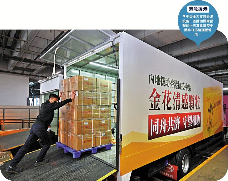 圖:緊急援港/中央全力支持香港抗疫,首批由國家捐贈的十五萬盒抗疫中藥昨日迅速運抵香港。(大公報 記者 程晚村、黃釔淼、義昊、柴進、郭若溪、劉凝哲)香港疫情嚴峻,中央全力支持。來自內地的援港抗疫物資,火速運抵香港,包括15萬盒抗疫中藥、2500萬個國家標準KN95口罩,大批防護服、快速檢測包……從鮮活食品到食水、燃油再到抗疫物資,無微不至地為香港帶來堅實保障,為港人送來溫暖。