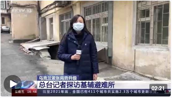 总台记者在基辅市中心一街道出镜报道时突遇空袭警报,她背着应急物资紧急躲入附近庇护所。