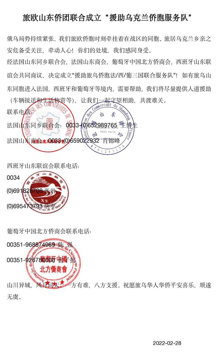 经法国山东同乡联合会,法国山东商会,葡萄牙中国北方侨商会,西班牙山东联谊会共同商议,决定成立“援助旅乌侨胞法/西/葡三国联合服务队”!如有旅乌山东同胞进入法国,西班牙和葡萄牙等境内,需要帮助,我们将尽量提供人道援助(车辆接送和生活物资等),让我们一起守望相助,共渡难关。