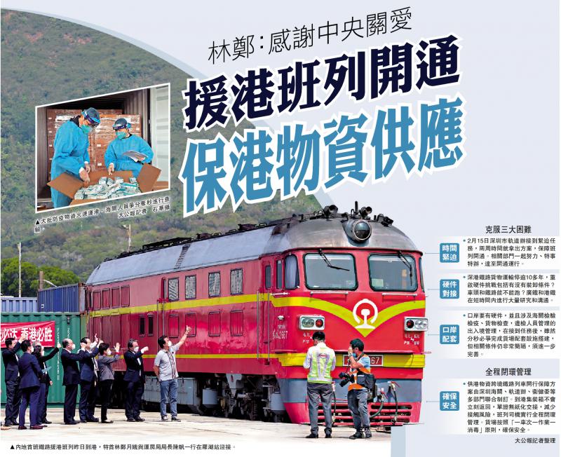 林鄭月娥率多位特區官員昨日迎接首趟鐵路援港班列。她表示,鐵路援港班列將保障香港在嚴峻的新冠肺炎疫情下,物品、食品供應穩定。她提到,上世紀60年代,在周恩來總理的關心下,開創了每日「定期、定班、定點」的「三趟快車」,照顧了香港同胞的生活需要。現在,在香港嚴峻的新冠肺炎疫情下,鐵路援港班列開通,更是體現了中央對香港的關愛和支持。