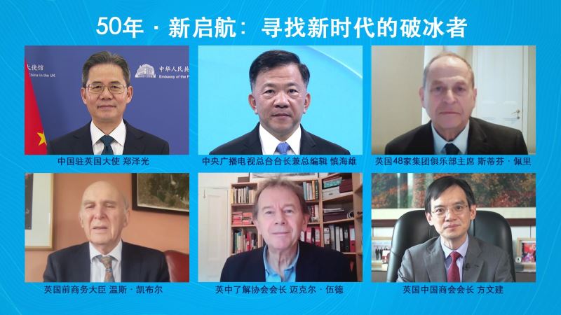 3月13日,是中英建立大使级外交关系50周年。由中央广播电视总台发起主办的媒体活动——“50年·新启航:寻找新时代的破冰者”大型融媒体互动节目正式启动。中宣部副部长、中央广播电视总台台长兼总编辑慎海雄,中国驻英国大使郑泽光,第一代“破冰者”杰克·佩里之子斯蒂芬·佩里,英国前副首相迈克尔·赫塞尔廷,英国前商务大臣温斯·凯布尔等十余位中外嘉宾出席了线上启动仪式。