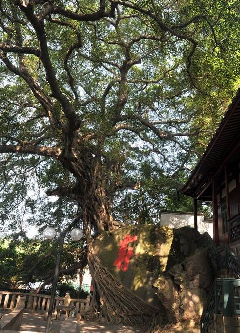 比如,森林公园的榕树王,冠幅1300多平方米,树下可纳千人,据说系张伯玉所植。罗星塔公园的中国塔榕,系左宗棠办船政时所栽,相传林纾常坐树下思妻,悲而黯然泪下,因而寄情翻译《巴黎茶花女遗事》。肃威路裴仙宫内小叶榕王“榕城第一古榕树”,据说日侵袭福州,空投炮弹,被浓密枝叶半空拦截,未爆,保周边民众安然无恙,人称“镇城之宝”。还有省政府门前环岛内的华林寺古榕、于山戚公祠旁的寿岩榕、杨桥路高峰桥的人字榕、双抛桥的合抱榕、仓山林浦泰山庙的泰山榕、高宅村香积寺左侧的甲天下榕、三宝寺后的望龙台古榕、朱紫坊的龙墙榕,福清东山村“古榕听涛”、普礼村“古榕清风”,闽侯白沙连坑村省级文保远济桥之上的千年红榕、新坡村县级文保永奋厝后的古红榕等等。