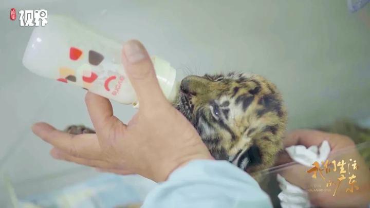 出生后的幼虎被放到保温箱进行隔离保护,饲养员化身虎爸给幼虎喂奶。