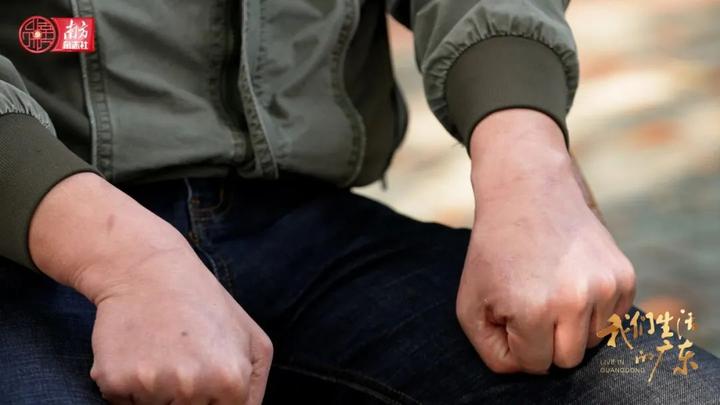 饲养员雷胜桥在照顾幼虎的过程中经常被幼虎抓伤,双手布满疤痕。