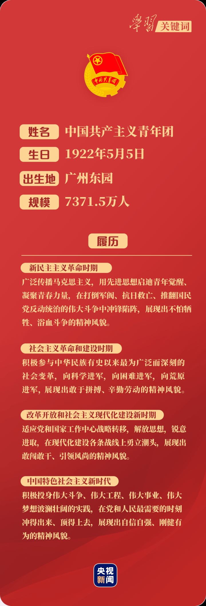 “今天,我们在这里隆重集会,庆祝中国共产主义青年团成立100周年,就是要激励广大团员青年在实现中华民族伟大复兴中国梦的新征程上奋勇前进。”庆祝大会上,习近平总书记开宗明义。