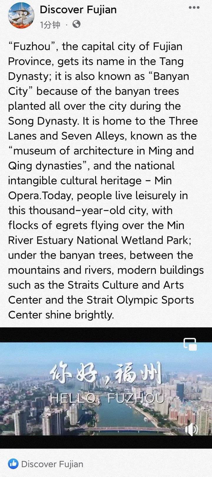 “发现福建”脸书账号展播《你好,福州》城市形象宣传片