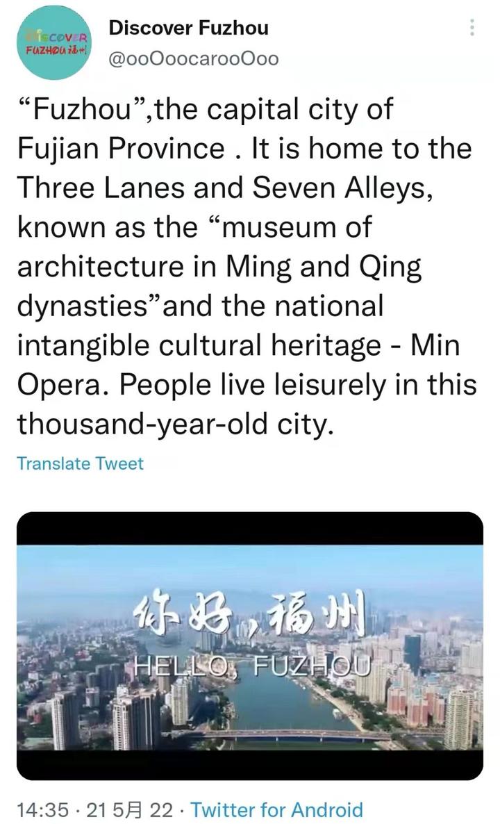 “发现福州”推特账号展播《你好,福州》城市形象宣传片