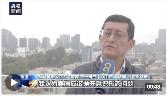 近日,秘鲁圣马科斯国立大学南美-亚洲研究中心主任卡洛斯·罗德里格斯接受总台记者采访时表示,美国将古巴、委内瑞拉和尼加拉瓜三国排除在美洲峰会之外,是纯粹受利益驱使。他呼吁美国抛开意识形态问题。