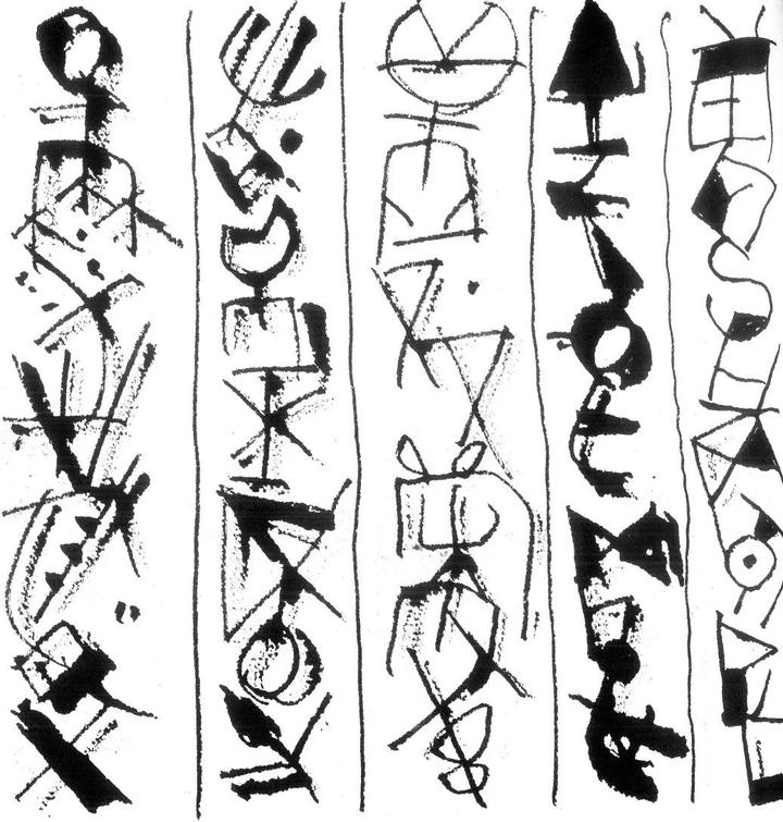 韩美林从散落多地的甲骨、石刻、岩画、古陶、青铜、陶器、砖铭、石鼓等文物遗存上,搜寻记录了数万个古文字符号,并对这些符号精心临摹、整理、创作,用类似文字的方式将其表达出来,耗时几十年汇集成“天书”。
