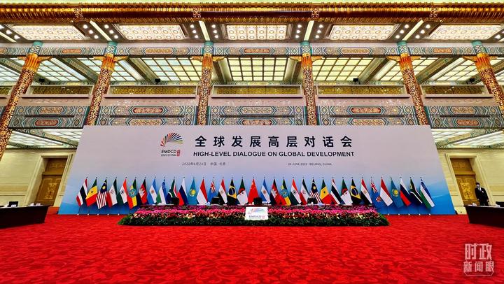 全球发展高层对话会的中方会场,设在人民大会堂金色大厅。林立的参会国旗帜、红色的地毯,映衬着会议的热度。