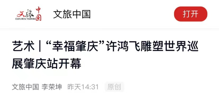 为丰富环星湖旅游业态,提升肇庆市旅游知名度,7月8日至8月2日,由中共肇庆市委宣传部、广州市文化广电旅游局指导,广东花城美术馆主办,肇庆市文化广电旅游体育局、星湖管理局、端州区人民政府协办,以“幸福肇庆”为主题的许鸿飞雕塑世界巡展肇庆站在广东省肇庆市七星岩东门广场、牌坊广场及岩前村沿线绿道小广场举行。