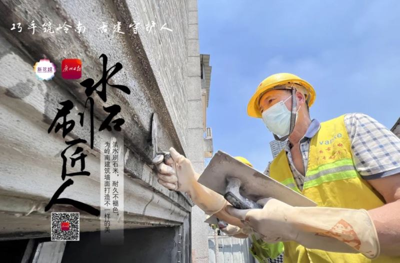 如今,水刷石匠人依然在民间活跃,成为这批近现代岭南建筑的守护人。56岁的吴伟职在水刷石行业干了40年,今年5月,他在荔湾区南漖村的武帝古庙进行古建修复。