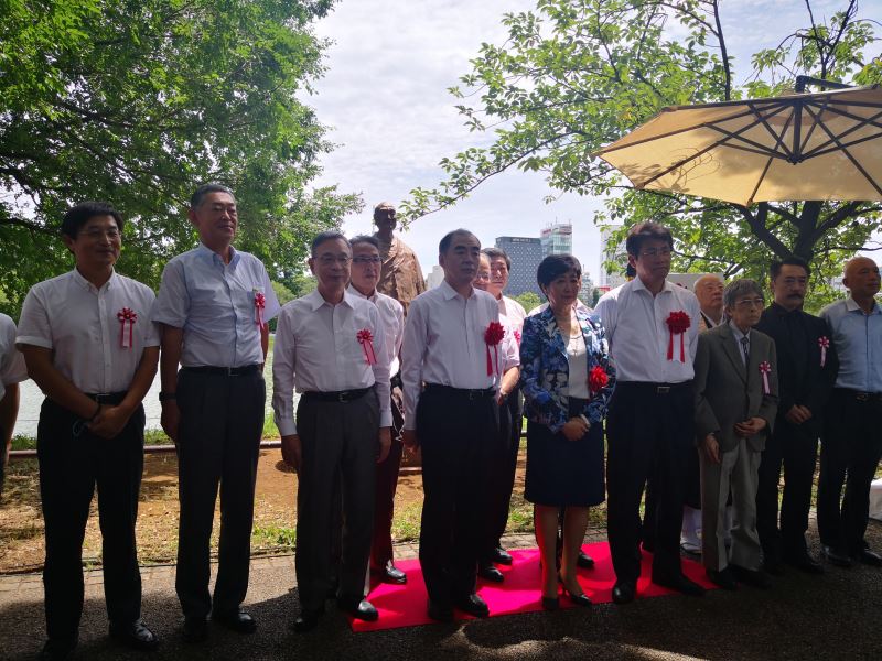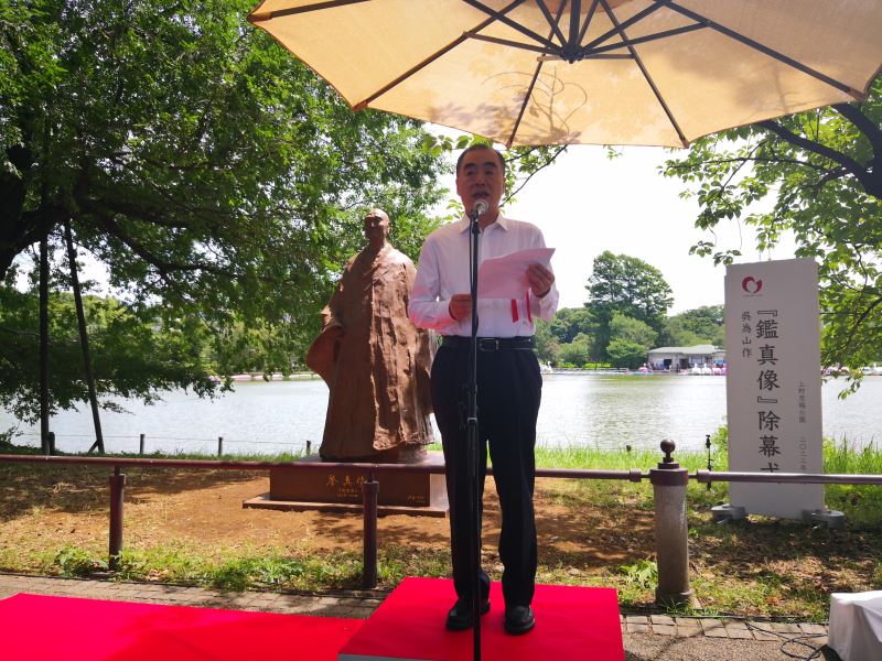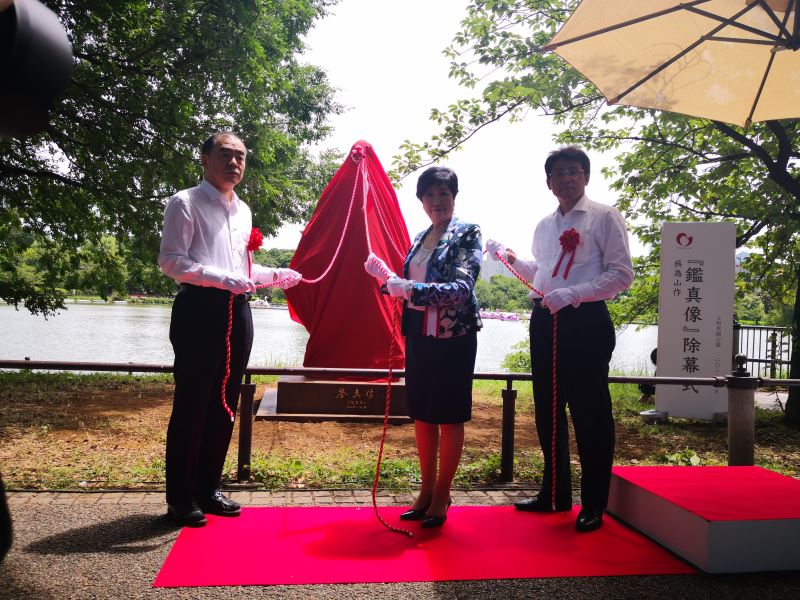 中国驻日本大使孔铉佑、东京都知事小池百合子女士、日本外务大臣政务官三宅伸吾等中日嘉宾共同为《鉴真铜像》揭幕。铜像将永立于风光秀美的上野恩赐公园不忍池畔,供游客和民众参观瞻仰。