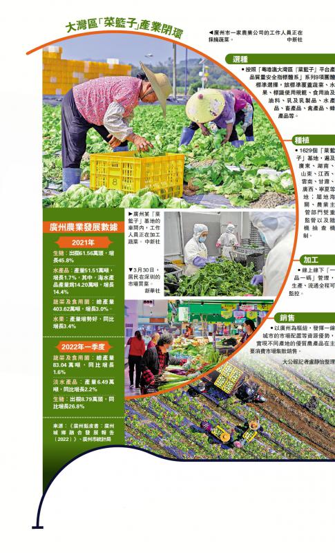 資料顯示,粵港澳大灣區「菜籃子」工程是廣東省委省政府主導打造的惠民工程,旨在促進粵港澳大灣區農產品質量安全標準和品質的提升。大灣區「菜籃子」工程以廣州為樞紐,發揮一線城市的市場配置等資源優勢,實現不同產地的優質農產品在主要消費市場集散銷售。透過大灣區「菜籃子」工程體系,來自全國各地的一袋袋安全糧、一籃籃放心菜、一塊塊健康肉,源源不斷從田間地頭、生產基地成功走上粵港澳大灣區市民的餐桌。