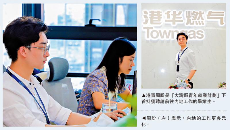 政府鼓勵青年北上尋機遇,去年一月推出「大灣區青年就業計劃」,計劃共收逾兩萬份求職申請,但最終只有一千餘人獲聘入職,至今剩下約八百人仍然在職。正在蘇州出差的港青周盼,是「大灣區青年就業計劃」下首批獲聘請前往內地工作的畢業生,任職於香港中華煤氣有限公司全資子公司名氣家(深圳)信息服務有限公司的市場部,從事品牌新媒體賬號的推廣,亦負責整合行銷方案協同業務,是煤氣公司在計劃下共聘用的12位同事之一。