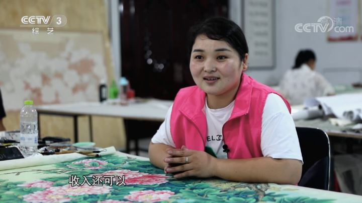 山东省巨野县鲁西书画院画师 孟艳云:一个月有时候七八千,八九千,平时在完成一幅画的时候就是说完成了的时候效果特别满意,就特别开心,然后中间又不耽误照顾孩子,收入还可以,非常地好了。