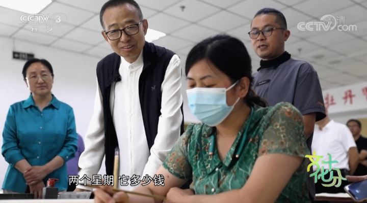 中国工笔画学会会长 陈孟昕:他还是有用笔的感觉,他还需要一定历练,然后慢一点,这样来走,收笔,让它笔透到纸里面去。