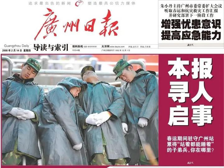 “2月5日,这张照片第一次见报,刊发在头版,但只是侧边一小块。随着全国人民连续的奋战,冰雪灾害造成的影响开始大幅减弱。2月14日,我结束春节休假回到广州,上班第一天就看到了报纸头版头条刊登着那张四名站着睡着的解放军战士照片,一旁的大字是:本报寻人启事——春运期间驻守广州站累得‘站着都能睡着’的子弟兵,你在哪里?”