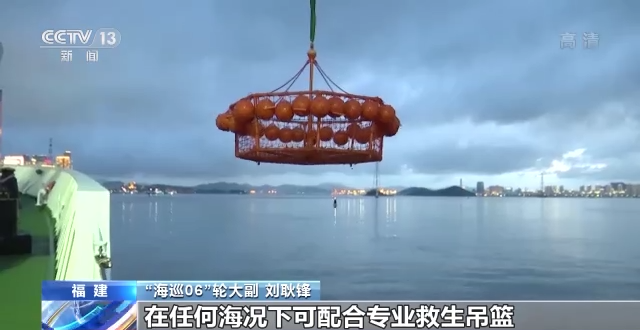 “海巡06”轮大副 刘耿锋:这两台设备就是“液压折臂吊”,最大臂展12米,在臂展12米时可安全吊重5.5吨,能够在各种海况下配合专业救生吊篮、救生捞网进行作业。
