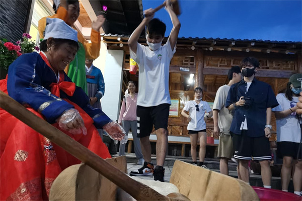 打糕作为朝鲜族群众日常饮食中的一项不可缺少的美食,其将蒸熟的糯米放到槽子里用木槌捶的制作方法也令此行的粤港澳大湾区青少年们好奇不已,在当地村民们的指导下,纷纷上手体验。