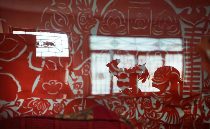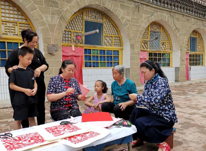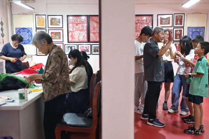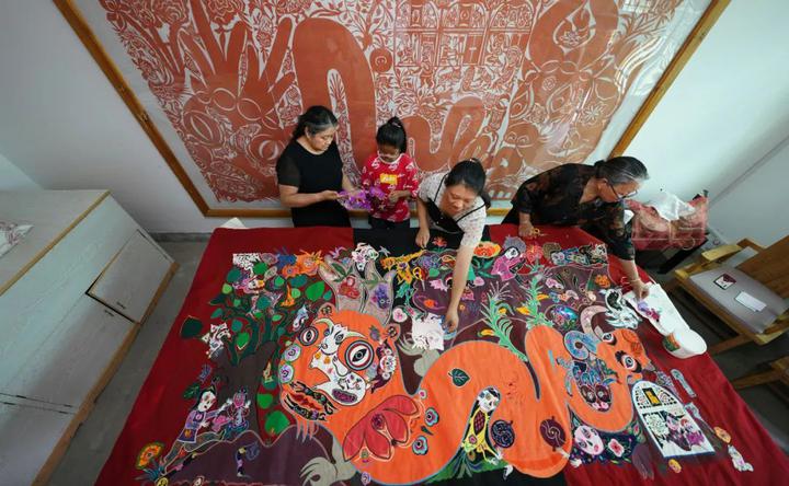 2022年8月11日,在陕西延安延川县高凤莲民间美术馆,民间剪纸艺术家高凤莲的女儿刘洁琼(左一)和家人在制作剪纸作品。李舸 摄