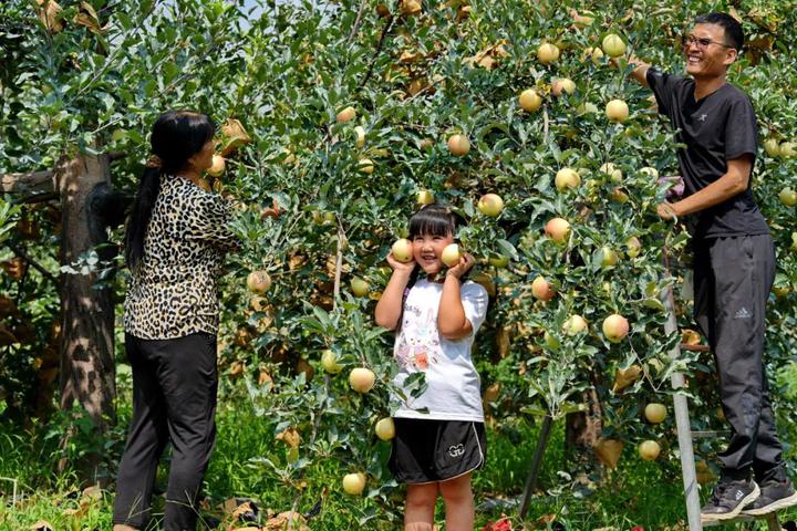 2022年8月11日,陕西宜川县云岩镇辛户村苹果种植户张东和家人在自家60亩果园里给苹果去套,望着快要成熟的苹果,6岁的女儿张泽析露出了幸福的微笑。柳军 摄