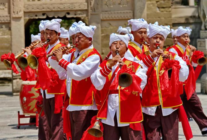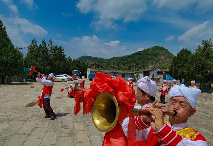 2022年8月14日,国家非物质文化遗产保护项目——子长唢呐在钟山石窟为游客表演。冯晓伟 摄