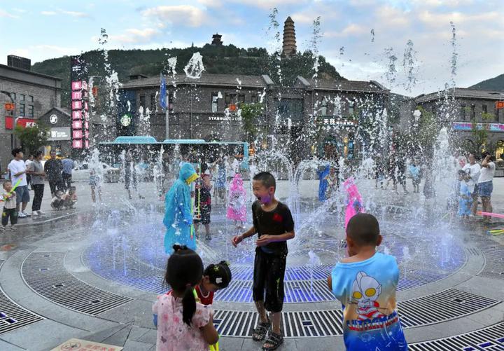 2022年8月14日,孩子们在延安市宝塔山下的文化广场上玩耍。居杨 摄