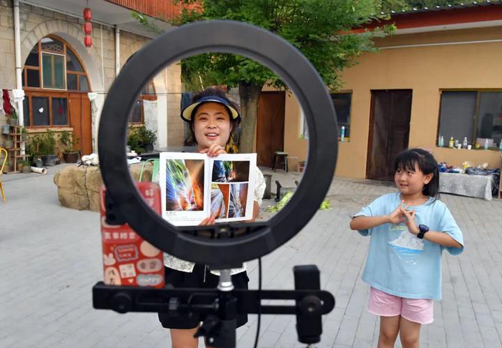 2022年8月13日,甘泉县下寺湾镇张家沟村的返乡创业女大学生郭延凤通过网络直播推介家乡的大峡谷风光。随着当地旅游产业的发展 ,郭延凤于四年前开办了窑洞民宿,走上致富路。 居杨 摄