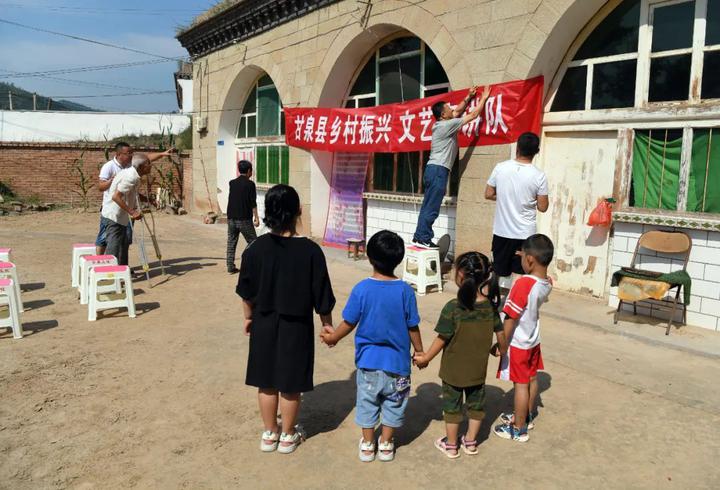 2022年8月13日,甘泉县乡村振兴文艺宣讲队工作人员在新庄科村进行宣讲前的准备工作。他们以陕北说书形式宣讲乡村发展。居杨 摄