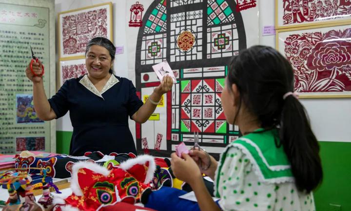 2022年8月14日,在陕西省延安市延川二中,民间剪纸艺术大师郭如林(图右举手者)正在指导学生剪纸。杨登峰 摄