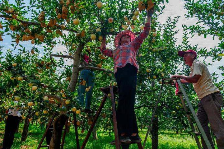 2022年8月11日,延安市洛川县阿寺村,果农在摘苹果袋。张兆增 摄