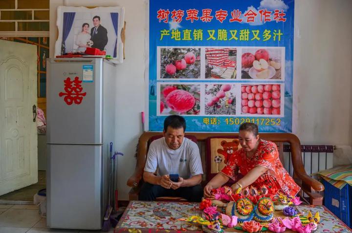 2022年8月11日,延安市洛川县阿寺村苹果生产专业户李榜田和爱人雷彩云在家中。雷彩云所做的面花曾在当地旅游文化节面花大赛上获一等奖。张兆增 摄