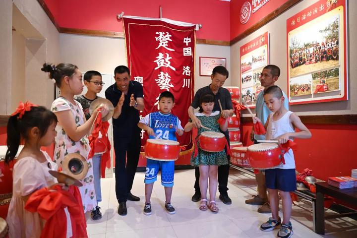 2022年8月12日,陕西省洛川县现头村,洛川蹩鼓非物质文化遗产国家级传承人张万玖(右三)与市级传人张三芳(左四)在教授村中儿童学习蹩鼓。毛建军 摄
