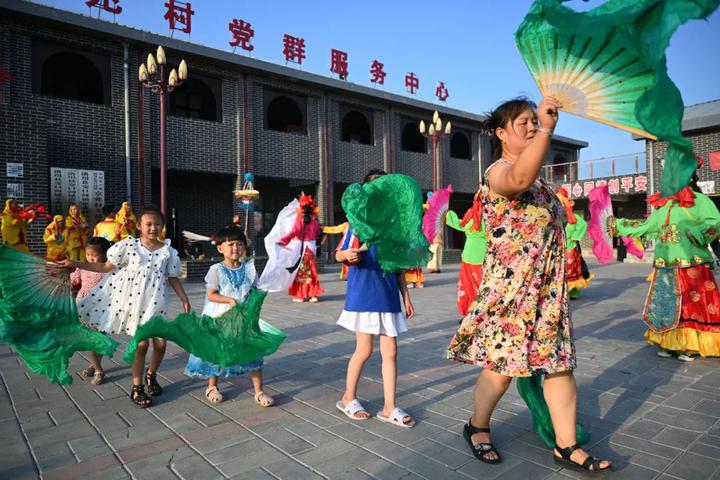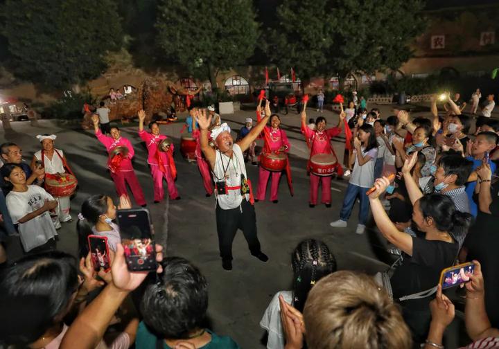 2022年8月12日,陕西省洛川县交河镇京兆村老秧歌表演队在村广场进行表演,吸引民众参与。毛建军 摄