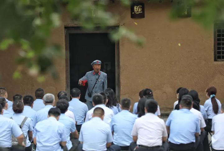 2022年8月16日,在陕西铜川陈家坡会议旧址,义务讲解员杜天祥用快板为西安一国企员工讲述革命故事。杨登峰 摄