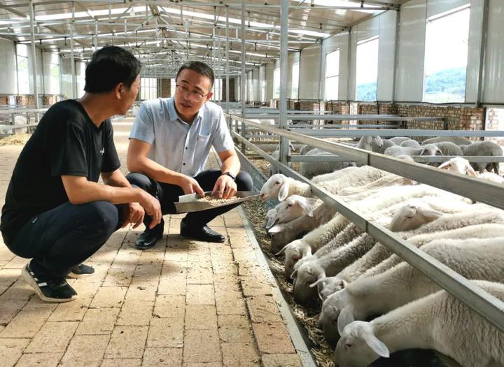 2022年8月13日,曾获得“全国脱贫攻坚先进个人”荣誉称号的甘泉县石门镇魏家沟村第一书记崔院强在魏平养殖农民专业合作社现场指导村民养羊技术。王学峰摄