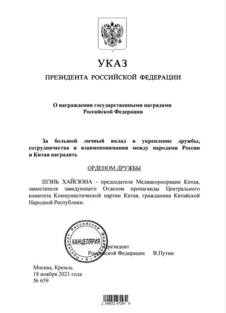 风姐了解到,这个奖项可不简单。奖项是根据俄罗斯联邦总统弗拉基米尔·普京的总统令颁授的。2021年,在《中俄睦邻友好合作条约》签署20周年,普京总统签发总统令,为中央广播电视总台台长慎海雄颁授友谊勋章,总台台长慎海雄也是中俄友好、和平与发展委员会媒体理事会中方主席。