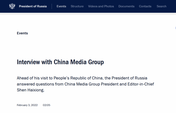 2022年2月3日,俄罗斯总统官网和中国国家通讯社、国家电视台同步发布消息,在受邀出席北京冬奥会开幕式前夕,俄罗斯总统普京接受了中央广播电视总台台长兼总编辑慎海雄的书面专访。虽是书面采访,但双方的提问和回答的现场感相当强,且信息量大,不亚于2018年5月31日慎海雄在克里姆林宫独家专访普京的效果。