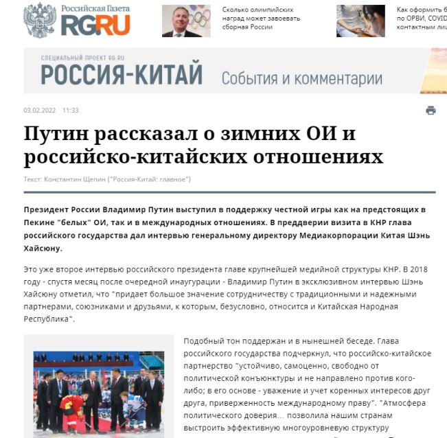 俄罗斯政府机关报《俄罗斯报》网站刊发题为《普京评述北京冬奥和俄中关系》的评论文章