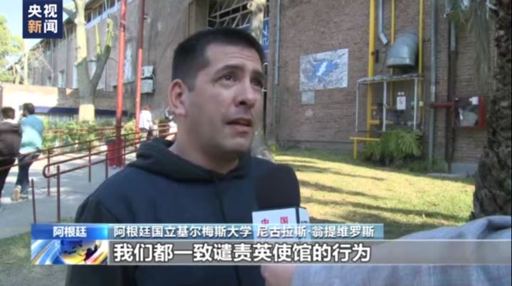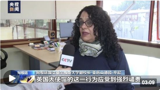 阿根廷国立基尔梅斯大学副校长 亚历山德拉·辛尼:英国大使馆的这一行为应受到强烈谴责,践踏了我们宪法中规定的对于马岛的主权。