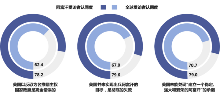 2001年,美国以反恐为名发动阿富汗战争。在受访的阿富汗民众中,有78.2%的受访者却认为“美国以反恐为名推翻另一个主权国家政府的做法是完全错误的”,在全球也有62.4%的受访者持相同观点。此外,有79.6%的阿富汗受访者认为“美国并没有实现当时出兵的目标,是彻底的失败”,这一比例在全球受访者中也达到67%。